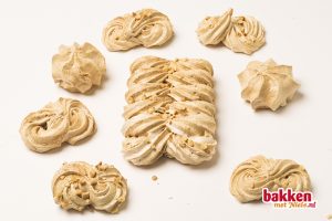 Benodigdheden: 1 potje Bakken met Niels mix voor meringue (inhoud 200 gram), 100 g /ml heet water (70 graden), bij voorkeur digitaal afwegen. 100 gram poedersuiker. Mixer met garden. Royale beslagkom. Bijvoorbeeld een KitchenAid of een Kenwood. Maar het kan natuurlijk ook prima met een kleinere mixer. Bakplaten met bakpapier.