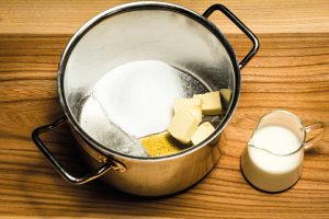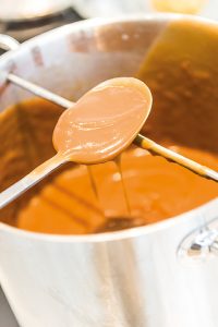 Om te zorgen dat het proces goed verloopt, is het belangrijk om tijdens het karamelliseren niet te roeren. Laat het mengsel rustig op een middelmatig vuur karamelliseren totdat er een mooie lichte karamel kleur zichtbaar wordt. Des te langer de massa kookt, des te pittiger de karamel wordt. De keuken wordt met een heerlijke karamelgeur gevuld. Haal de pan op tijd van het vuur zodat de suiker niet verbrandt.