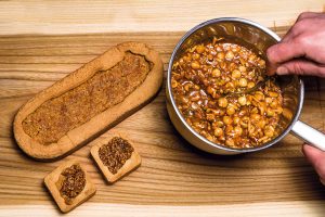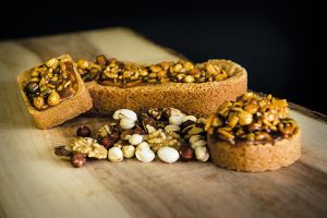 De afgekoelde slof voorzien van een mooie laag karamel met noten. Deze karamelnotentopping moet uiteraard een beetje lauw zijn zodat je het goed kunt verdelen over je slof (niet te vloeibaar anders loopt het weer van de slof af).